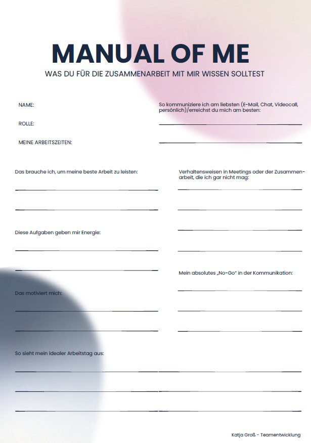 Das Manual of Me ist, ähnlich zum Team Canvas, für mich die beste Möglichkeit, strukturiert über Anforderungen an die Zusammenarbeit zu sprechen und sie anschließend produktiv in Abläufe zu integrieren. Dabei entscheidet ihr selbst, welche Fragen für euch wirklich wichtig sind: Kommunikation, Feedback, Konfliktbearbeitung oder Meeting-Gestaltung – you name it!